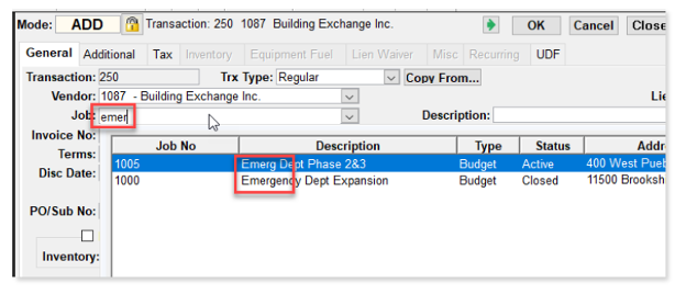 Users can search for vendors, customers, jobs, etc., using only part of a name or phrase.