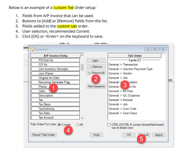 Ultimately, the custom tab order empowers construction professionals to more effectively navigate the construction accounting software.